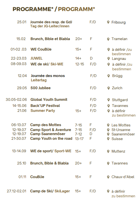 Nous sommes un groupe de jeunes, entre 14 et 25 ans, qui se retrouvent une fois par semaine. Nous voulons partager notre foi et grandir en elle. Notre programme consiste en diverses activités, que nous organisons régulièrement ensemble. Ici tu trouveras le programme actuel, plusieurs infos et ce que nous faisons.