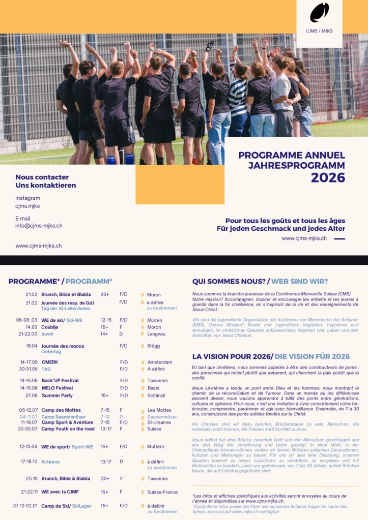 Février07.02 préparations dîner des générations (Benjamin 10h)08.02 Dîner des générations13-15.02 WE biblique Chaux-d'Abel21.02 Soirée série Mélanie (Léane 10h)28.02 JG Carlen (Yannick 10h)